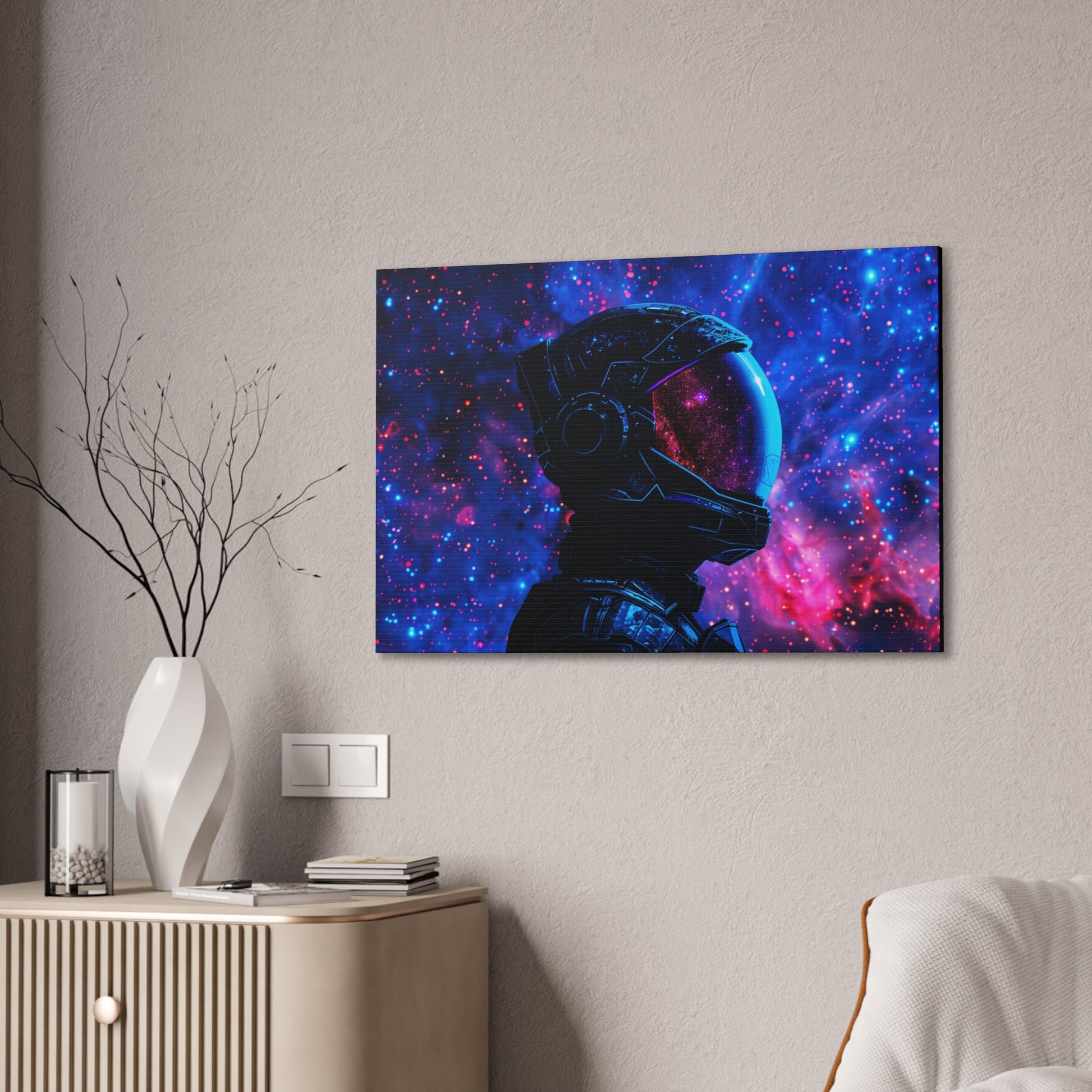 A vivid stretched canvas print that pulls your room toward the edges of the galaxy. Deep blues and electric magentas swirl around the silhouette of an astronaut, the helmet reflecting a nebula that feels both distant and immediate. Hung over a desk, in a gaming nook, or above a bedside shelf, this canvas invites quiet wonder and late-night daydreams. The slim 0.75" pine frame keeps the image feeling modern and low-profile, while vibrant dye-sublimation printing keeps the colors luminous and crisp. Small practical details — included mounting hardware and a discreet QR code on the back — make installation straightforward so the art becomes part of your space fast. Product features - 100% polyester heavy-weight canvas stretched over a 0.75" pine frame - Available in 20 sizes with horizontal, vertical, and square options - Vivid, high-resolution colors using advanced printing techniques - Comes assembled in the USA with mounting hardware and small QR code on the back - Note: design placement may shift 1–3 mm and may wrap slightly over edges Care instructions - If the canvas does gather any dust, you may wipe it off gently with a clean, damp cloth.