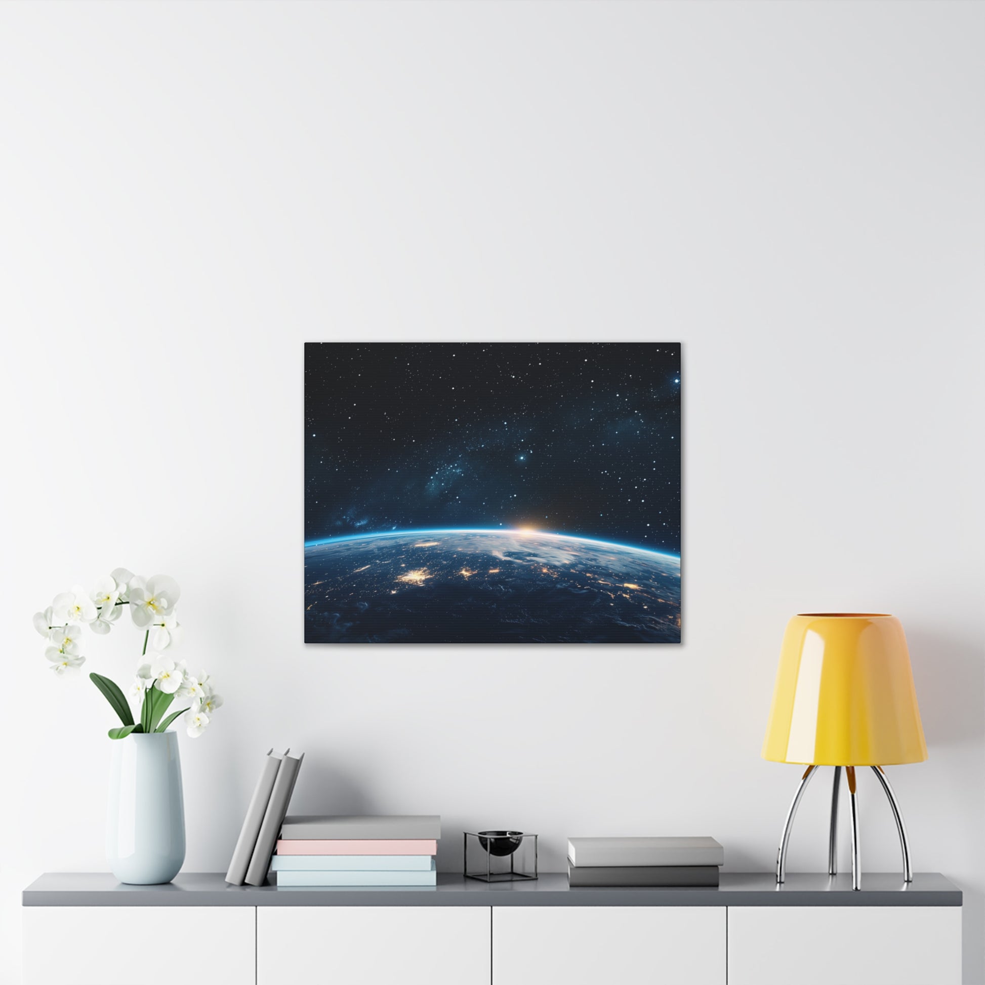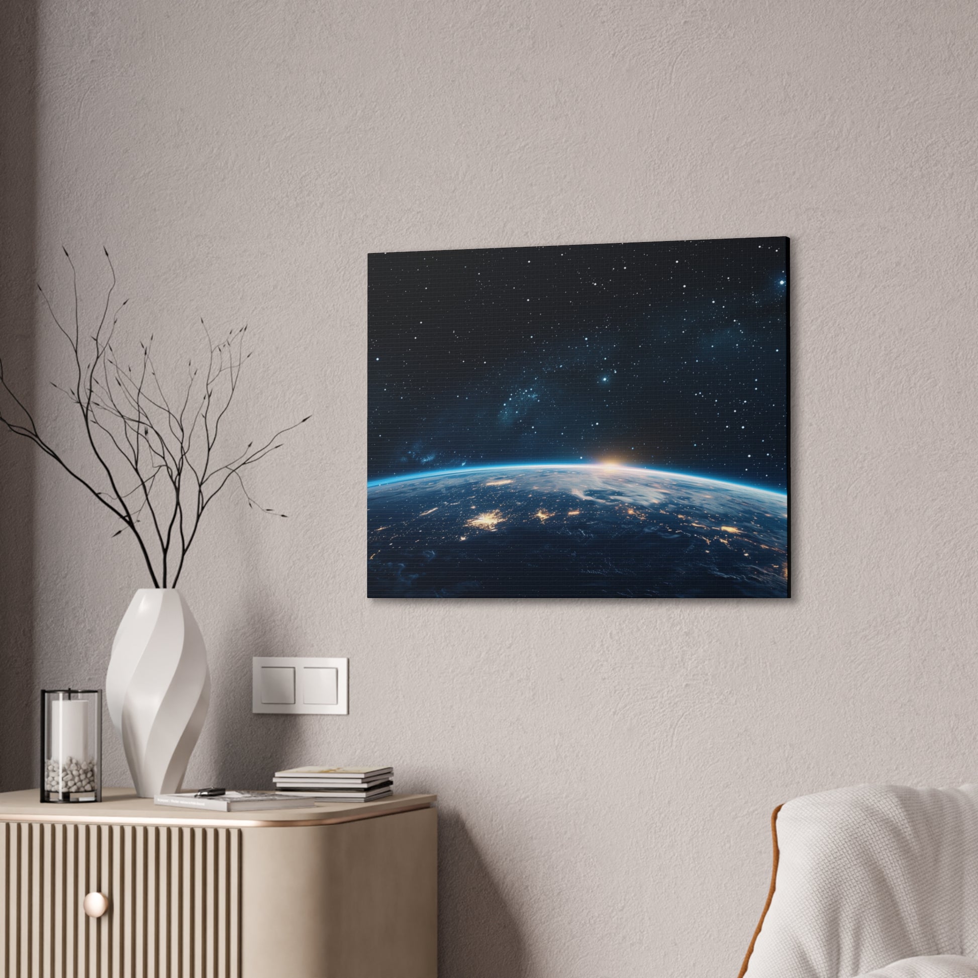 A calm, sun-warmed canvas that brings the hush of morning into any room. The Earth Sunrise Over Horizon print captures the moment light spills across the globe — soft gradients of gold and rose meeting deep, grounding earth tones. Hung above a bedside table, leaned against a mantel, or centered on a gallery wall, this stretched canvas creates a quiet focal point that feels like a slow, intentional breath. It pairs well with natural woods, woven textiles, and plants, and its understated energy suits spaces where mornings are savored and routines are grounded. The muted yet vibrant palette holds up in bedrooms, home offices, or entryways and adds a subtle sense of renewal to seasonal gatherings like winter solstice mornings or low-light holiday breakfasts. Product features - Heavy-weight 100% polyester canvas stretched over 0.75" pinewood stretcher bars - Available in 20 sizes with horizontal, vertical, and square orientations - High-definition printing for bright, crisp, long-lasting colors - Comes fully assembled with mounting hardware; small QR code on the back - Assembled in the USA from globally sourced parts; design may shift 1–3 mm over edges Care instructions - If the canvas does gather any dust, you may wipe it off gently with a clean, damp cloth.